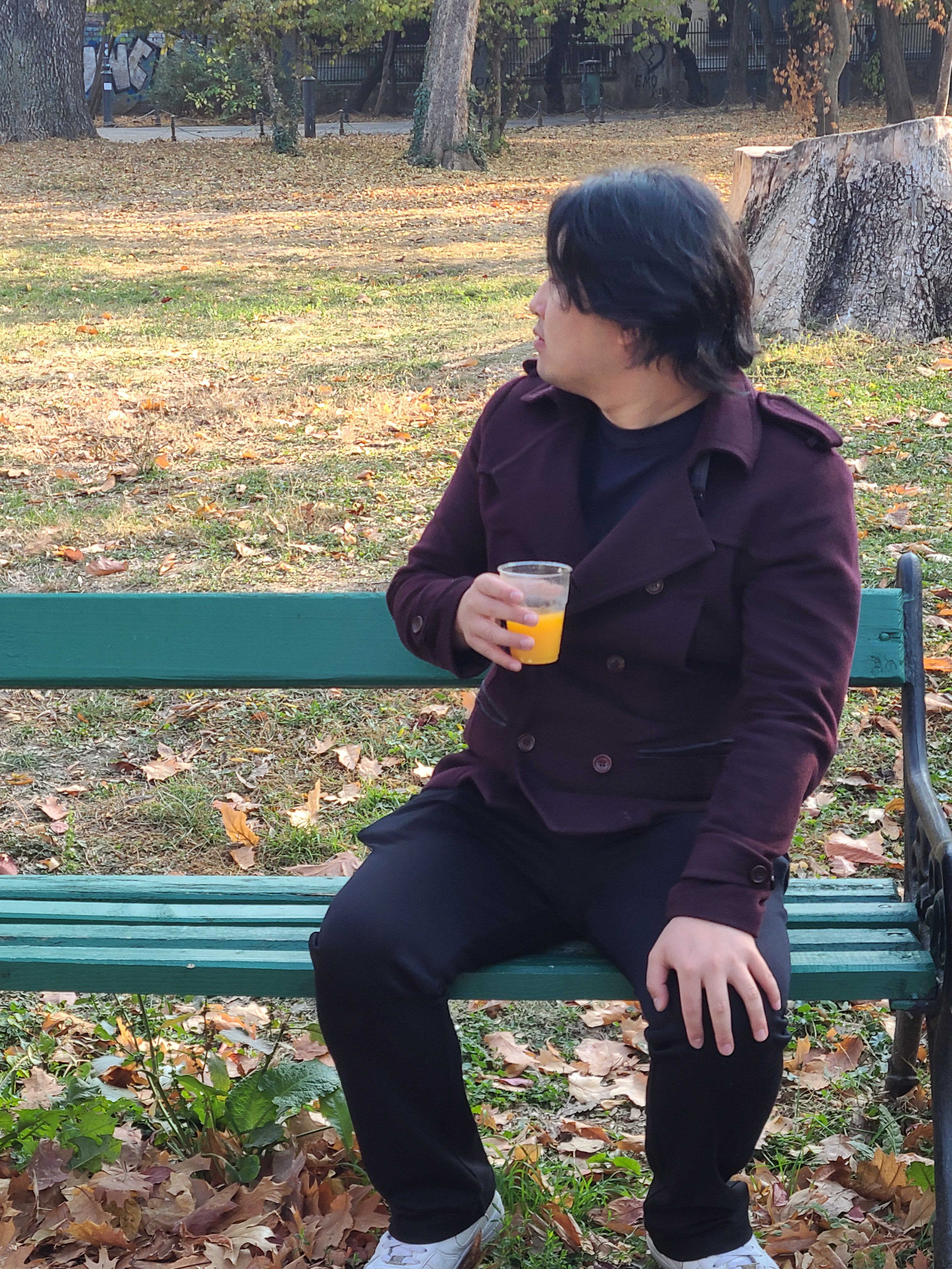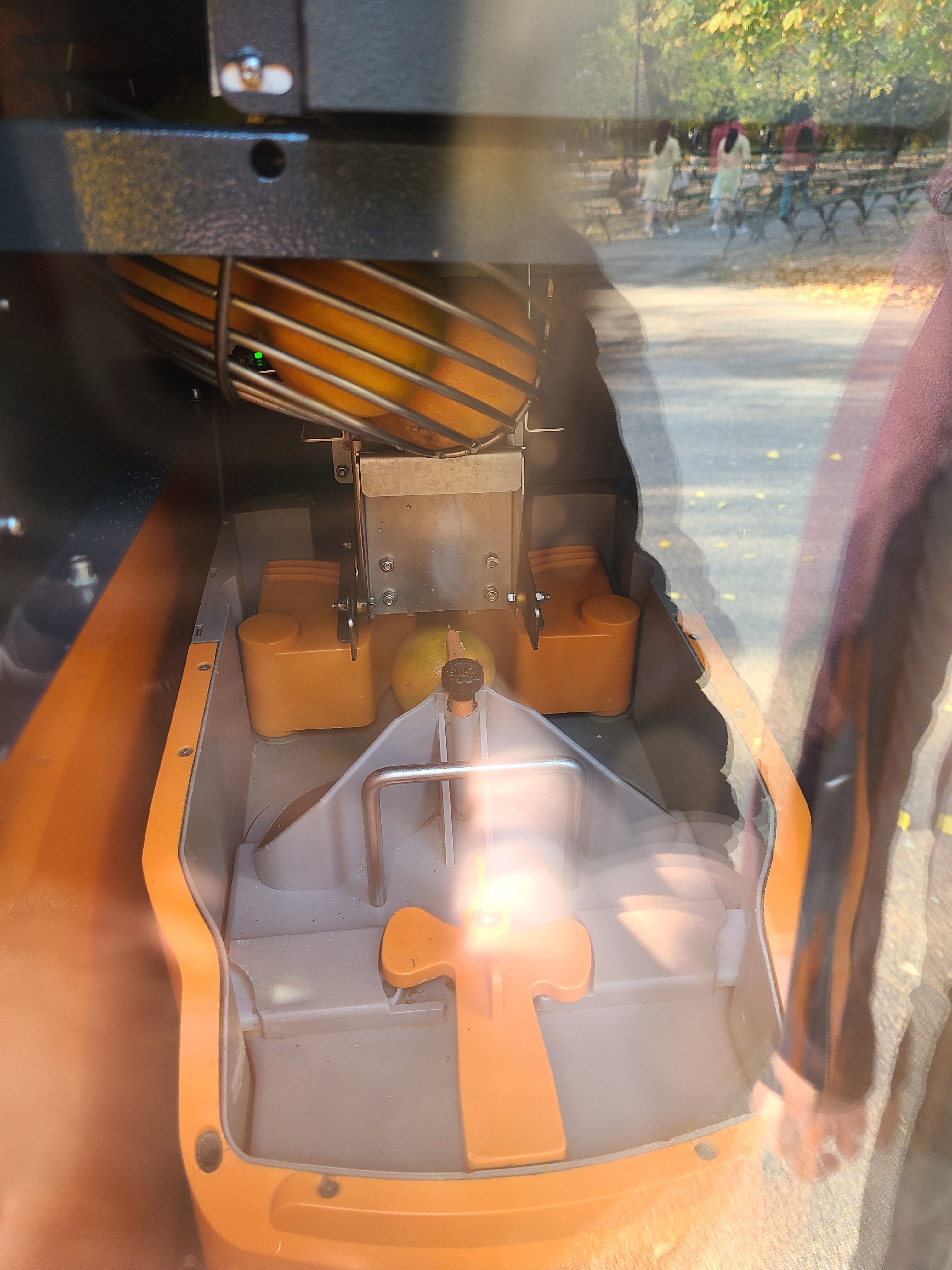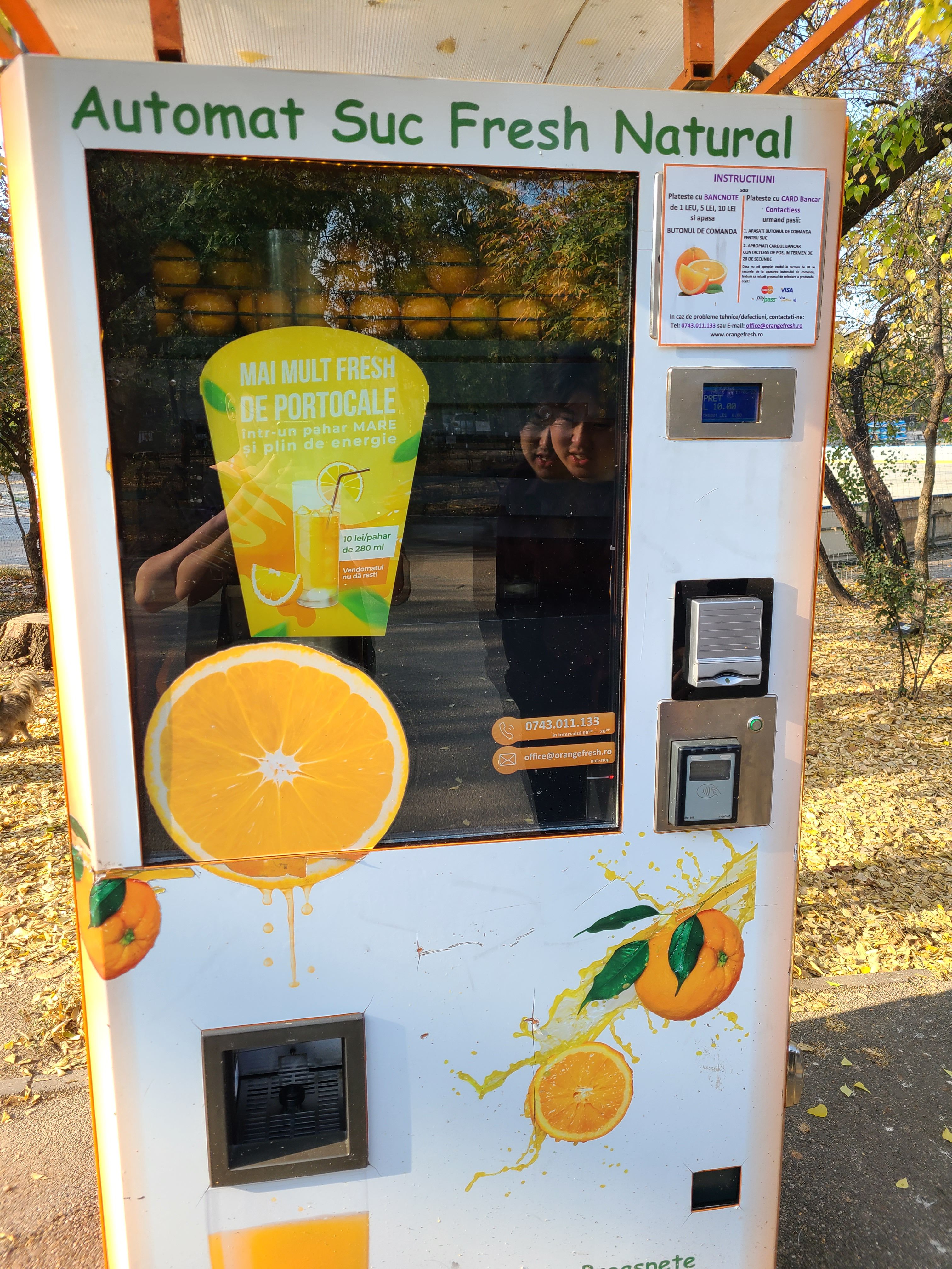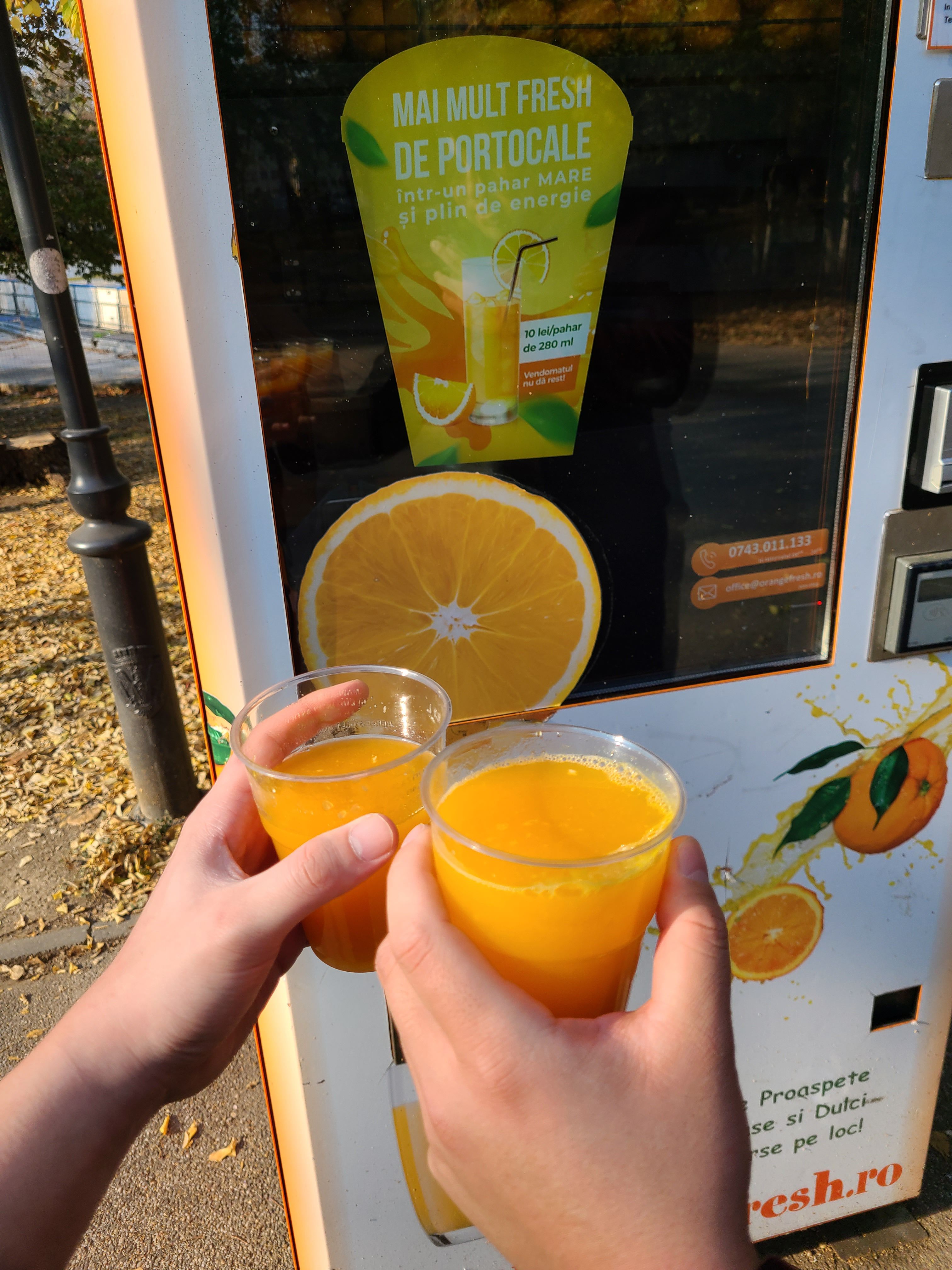 신나게 사진을 찍고 다시 다음 목적지로 발걸음을 옮겼다. 원래 다음 목적지는 Cișmigiu Gardens 라는 호수공원이었지만, 공사 중인 건지 호수에 물이 하나도 없어서 다음 공원으로 이동했다. 공원 초입에 신기한 오렌지 주스 자판기가 있었는데, 즉석해서 오렌지를 갈아주는 기계였다. 이런 건 또 참을 수 없지 바로 결제! 한화로 약 2800원 정도의 가격인데 오렌지가 5개정도 들어가는 것 같았다.