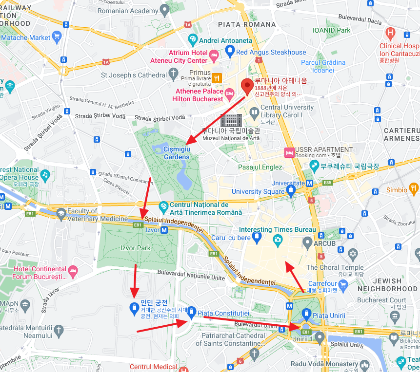 지도를 보고 대략적인 경로를 정했는데 숙소에서 가장 가까웠던 루마니아 아테니움을 시작으로 근처의 호수가 있는 공원, 그리고 길 건너 공원을 지나 인민궁전, 혁명광장을 구경하고 부쿠레슈티 호수를 지나서 Old town 근처를 돌고 돌아오는 코스였다.